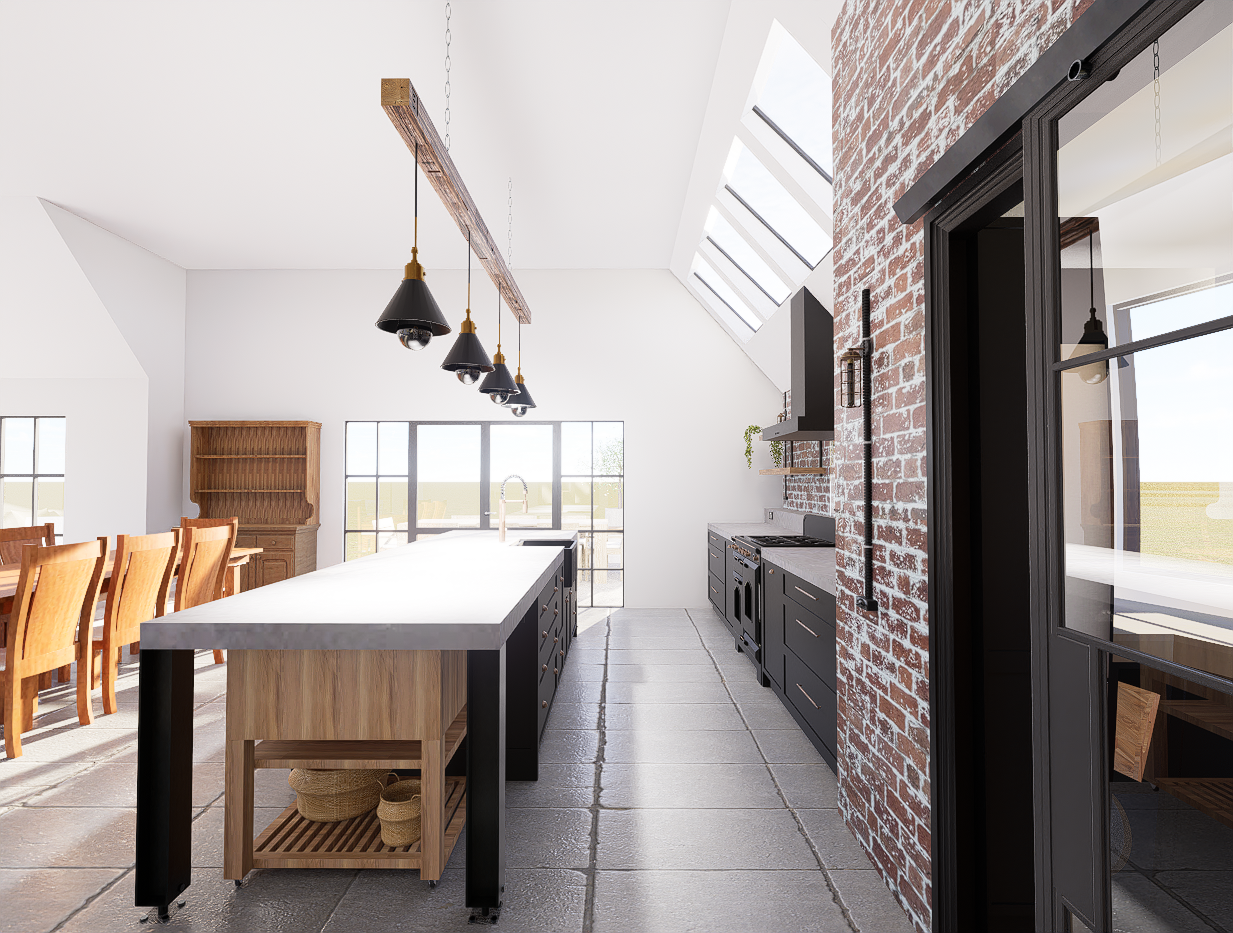 This off the grid Forest Home project completed in 2023, is a stunning example of industrial glam. With a rugged, textured look, this kitchen features a glossy tiled backsplash, and Melt pendant light that brings the whole look together. Maria Pomeroy Interiors, has created a truly remarkable kitchen space.